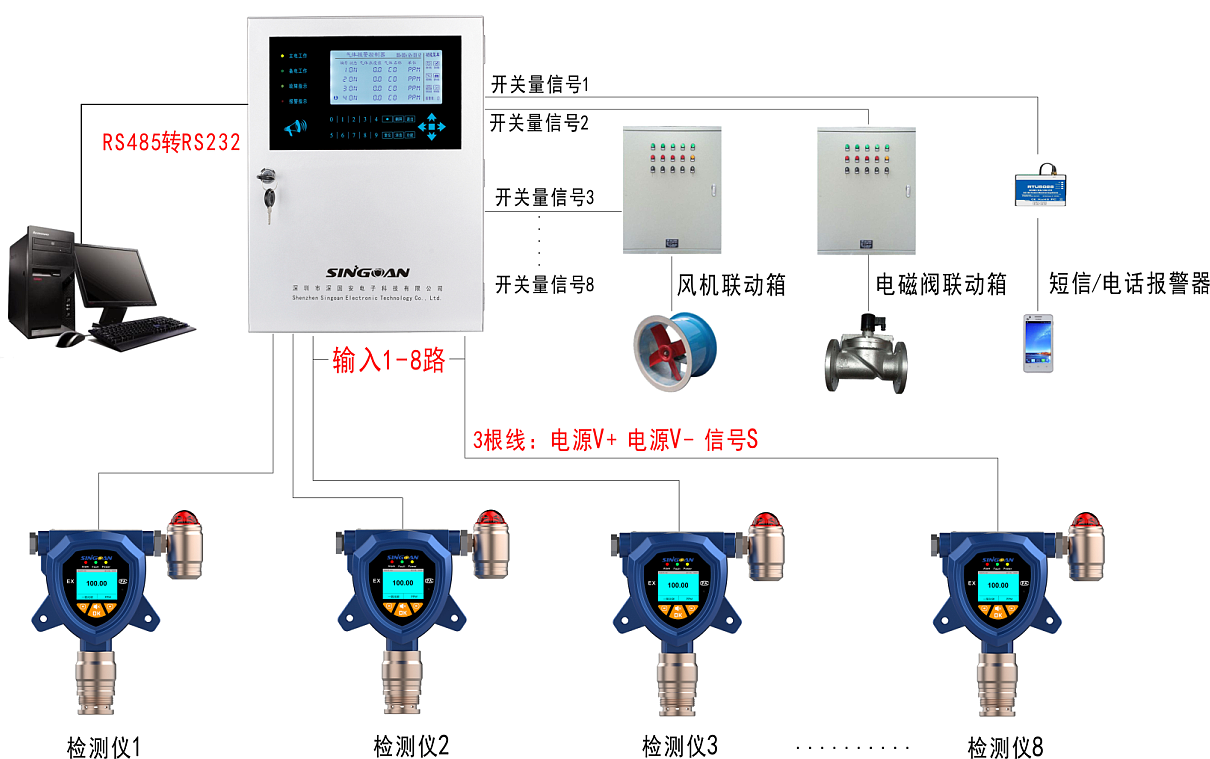 6)自帶8組繼電器開(kāi)關(guān)量信號(hào),可同時(shí)與多組電磁閥、風(fēng)機(jī)等進(jìn)行聯(lián)動(dòng);