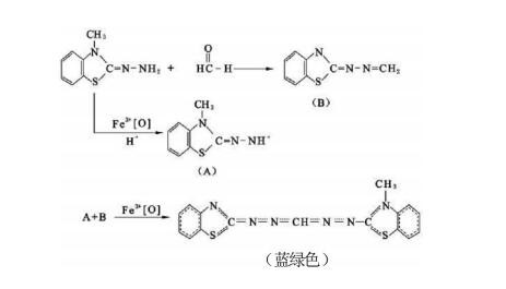 酚試劑3-甲基-2-苯并噻唑啉酮腙鹽酸鹽水合物(MBTH)檢測原理為3-甲基-2-苯并噻唑啉酮腙鹽酸鹽水合物(酚試劑)對于醛類具有極高的靈敏度,空氣中的甲醛與3-甲基-2-苯并噻唑啉酮腙鹽酸鹽水合物反應生成嗪,嗪在酸性溶液中被高鐵離子氧化形成藍綠色化合物,同時根據(jù)顏色深淺,能夠比色定量甲醛的濃度。