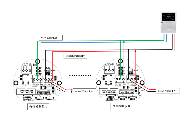 氣體檢測儀四線制多為RS485輸出信號,其布線多為總線制,即手拉手串聯(lián)布線。四線制的報警器中一般有四個接線端子,分別對應(yīng)供電正負和485信號正負,一般端子表示分別為VGAB,在四線制接線中,只需要將每個可燃氣體探測器的VGAB端子串聯(lián)至另外一臺報警器的VGAB端子即可。
